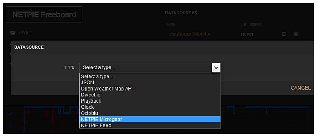 1.ด้านล่าง DATASOURCES คลิกที่ ADD จะปรากฏ Datasource Type ชนิดต่างๆ ให้เลือกเป็น NETPIE Microgear