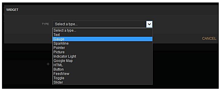 4.เพิ่ม Widget บน Panel ที่สร้างขึ้นใหม่โดย คลิกที่เครื่องหมาย + และเลือกชนิดของ Widget เช่น Gauge ตามตัวอย่างในรูป