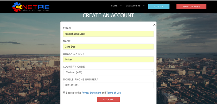 เราใช้อีเมลของคุณและหมายเลขโทรศัพท์เคลื่อนที่ในการระบุบัญชีของคุณ ในครั้งแรกที่คุณเริ่มใช้งาน password และ การกู้คืน (password recovery) จะถูกส่งไปถึงคุณด้วย SMS ที่หมายเลขที่คุณลงทะเบียนไว้ หากคุณมีปัญหาเนื่องจากไม่ได้รับข้อมูล password ผ่านทาง SMS กรุณาติดต่อ https://netpie.io/#contact