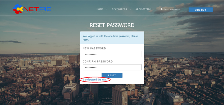 ในกรณีที่คุณเข้าใช้บัญชี NETPIE ครั้งแรก คุณจะได้รับ password ทาง SMS, เราจะถามคุณให้เปลี่ยนแปลง password ตามที่คุณต้องการ คุณสามารถข้ามขั้นตอนนี้ด้วยการคลิก "I understand the risk."